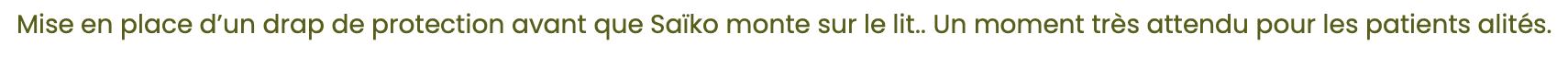 Saïko est très apprécié par tout l’équipe médicale. Ils sont tous unanimes pour dire que la venue de Saïko amène joie et apaisement chez les résidents. C’est la mascotte de l’hôpital.