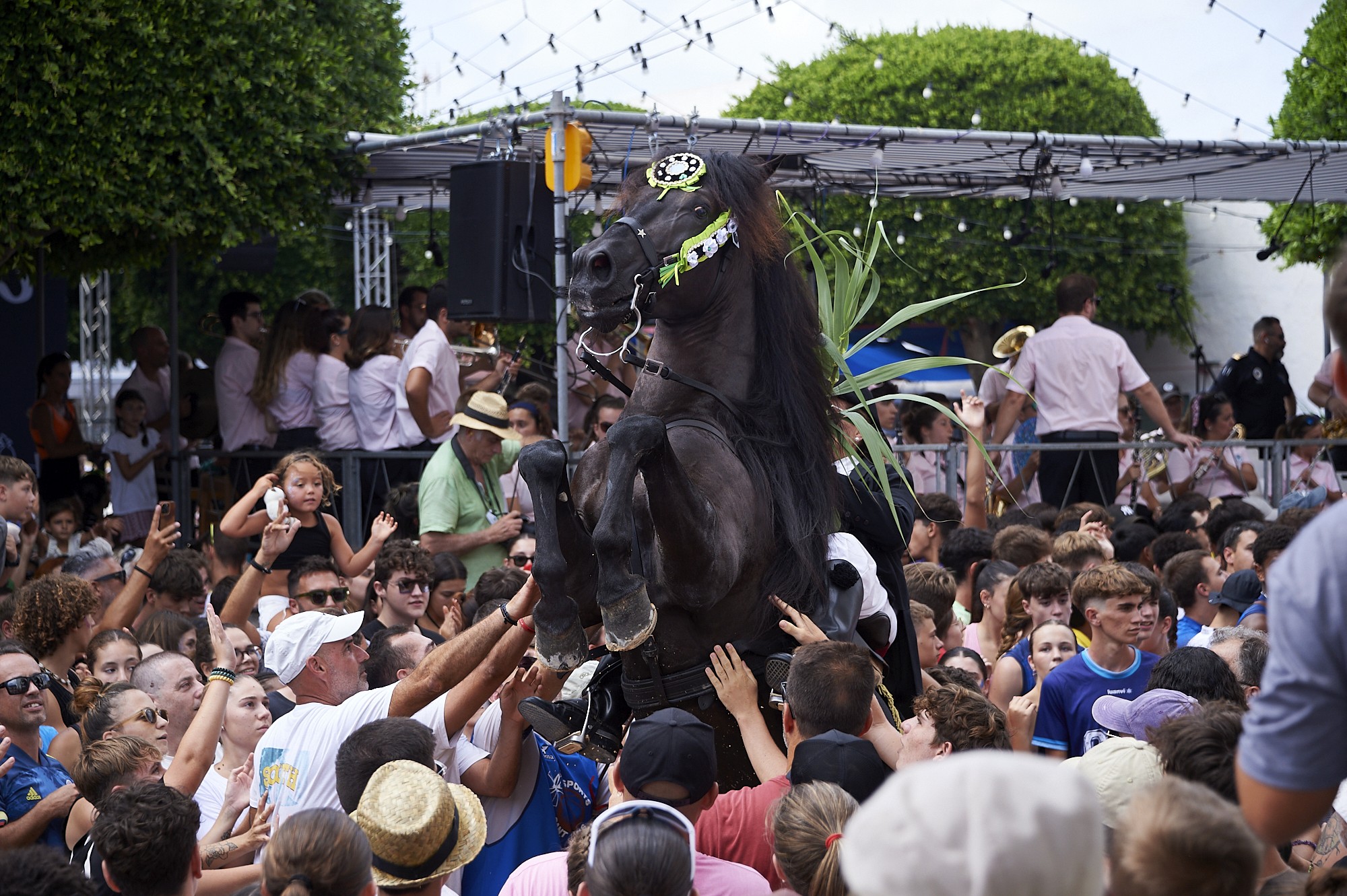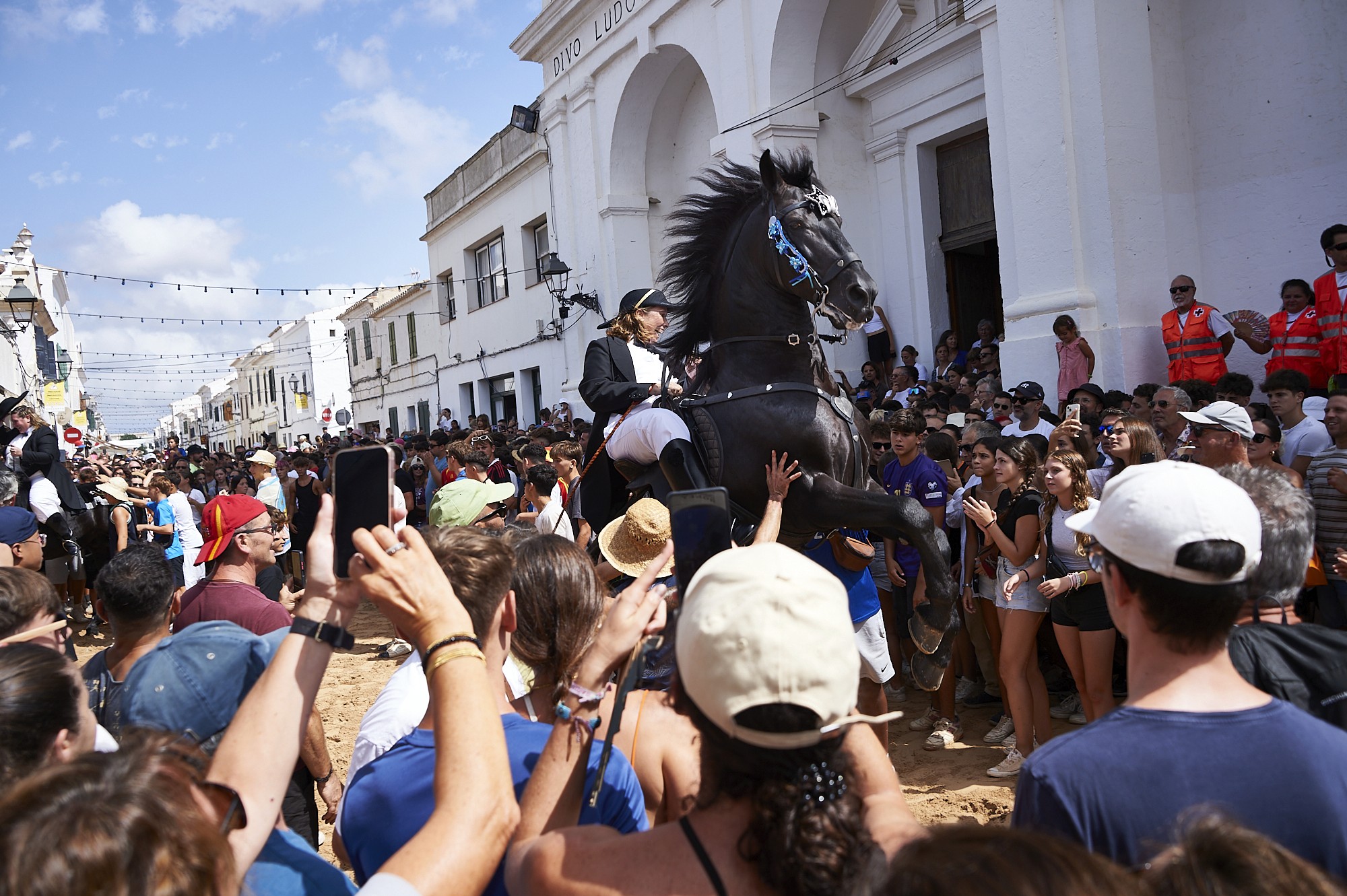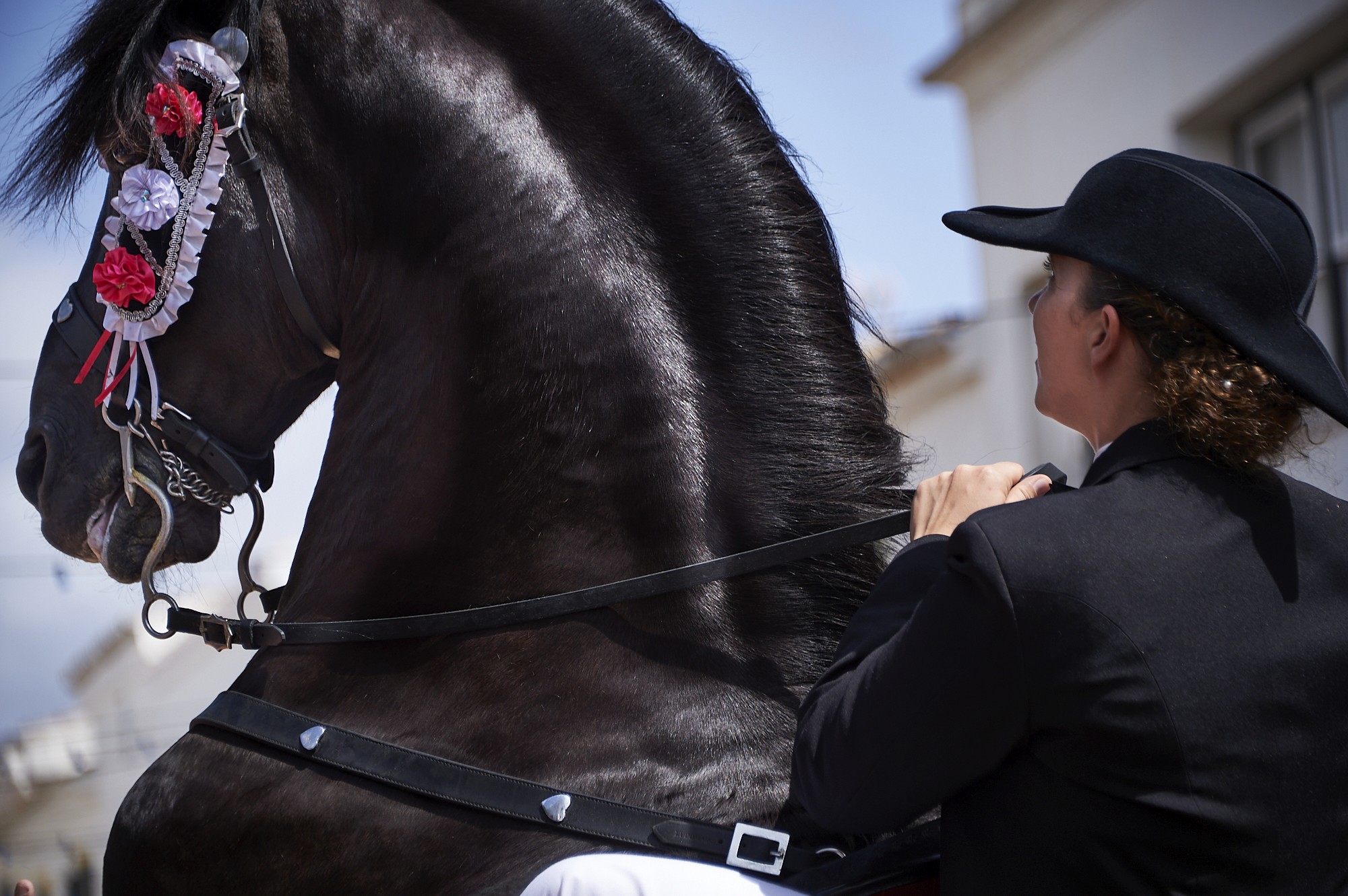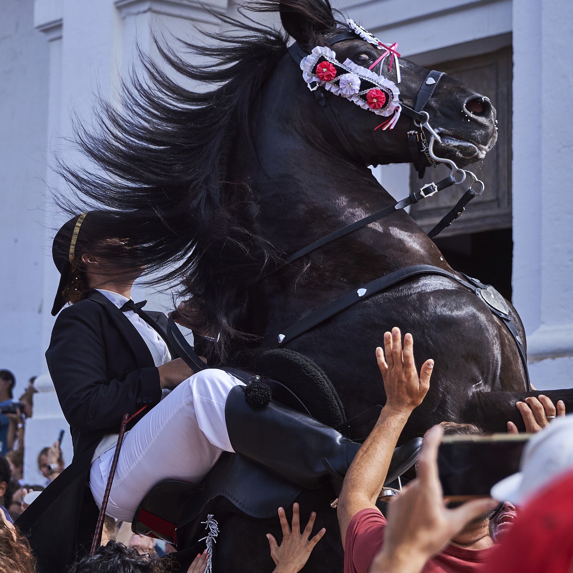Les Fêtes de Sant Lluís sont l’une des plus belles expressions de l’âme minorquine. Au cœur de ces célébrations, les chevaux noirs de l’île occupent une place presque sacrée. Ils exécutent le Jaleo, cette danse spectaculaire où ils se dressent sur leurs pattes arrière au milieu de la foule, emportés par les sonorités puissantes de la fanfare. Les participants tentent alors de toucher la poitrine des chevaux cabrés, un geste symbolique devenu l’un des moments les plus attendus et les plus intenses des festivités. À travers cette série, j’ai voulu saisir cette relation singulière entre l’homme et l’animal. Une connexion faite de confiance, de maîtrise et de respect, qui révèle la profondeur de cette tradition. Les cavaliers — les caixers — portent en eux l’histoire des différentes classes sociales de l’île. Ils défilent en habits traditionnels, mènent les processions religieuses, et incarnent ce lien ancien qui unit Minorque à ses chevaux. Mais les fêtes ne se résument pas à leur solennité. Elles sont aussi le théâtre d’une effervescence populaire où la créativité s’exprime librement : défilés de carrosses décorés, rues animées, moments de joie partagée. Cette dualité — entre ferveur religieuse, rite équestre et célébration collective — est au cœur de mon travail. Les cavaliers de Sant Lluís, ce sont des gestes hérités, des regards complices, des chevaux puissants, et toute une communauté rassemblée autour d’un patrimoine vivant. Une fête où chaque instant montre combien cette tradition reste essentielle à l’identité minorquine.